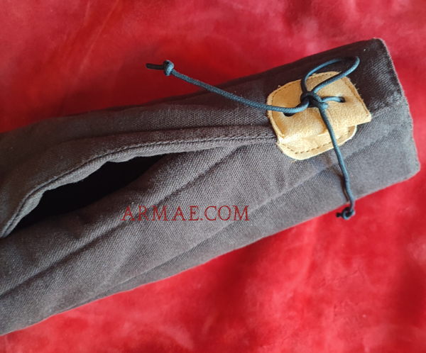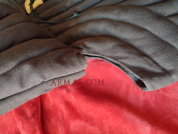 Au XIVème siècle, le gambison devient encore plus court après l'adoption de l'armure de plates, qui présente des articulations compliquées. Il supporte essentiellement la cuirasse qui protège Le buste du combattant. Les jonctions avec les membres sont alors couvertes par des pièces rapportées : spalières et tassettes renforcées de pièces de mailles. La forme des coutures des épaules est conçue pour améliorer la flexibilité du gambison, et faciliter les mouvements. C'est également la raison de la présence d'ouvertures sous les bras. L'extrémité des manches est ouverte, pour permettre d'en ajuster la taille au niveau du poignet. Il se ferme par laçage, les œillets étant renforcés de cuir.