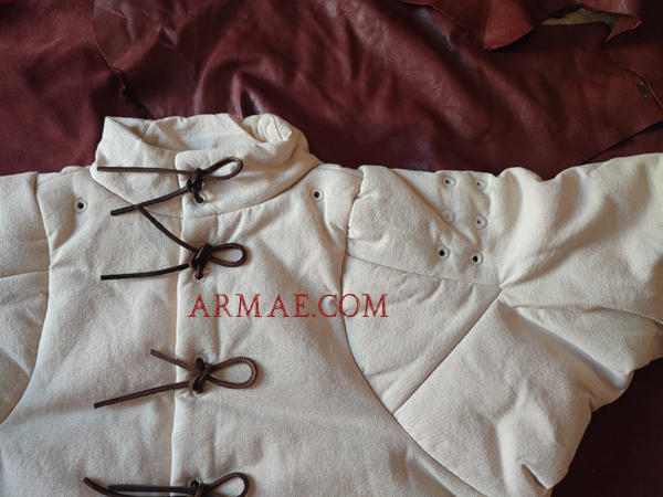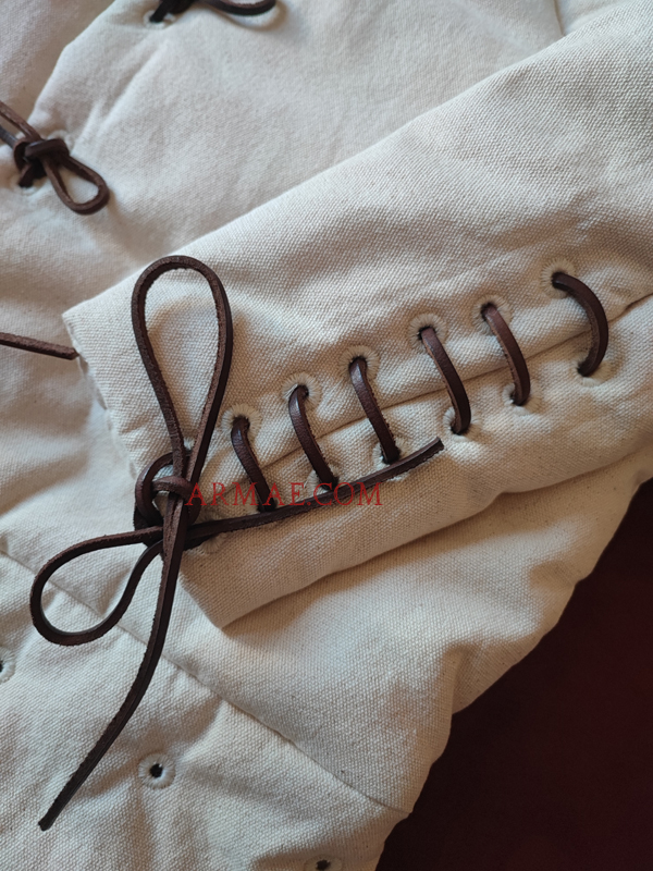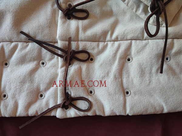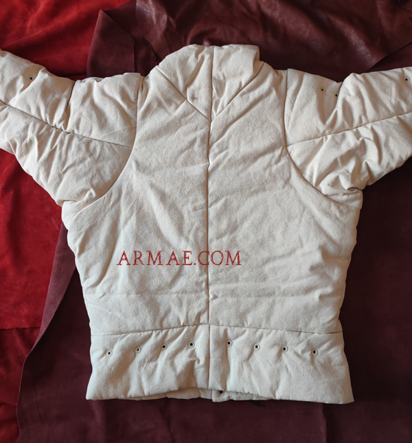 Ce gambison diffère de nos autres modèles par sa longueur bien plus courte, et sa forme cintrée et ajustée. Il s'agit d'un modèle correspondant à la toute fin du moyen-âge et au début de la renaissance, avec des armures de plates dont le torse est bien plus court. Il dispose de très nombreux œillets destinés à passer les aiguillettes et cordons permettant de fixer les différentes pièces de l'armure.