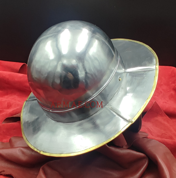 Réalisé tout en fer, avec des bordures en laiton, ce prototype se rattache à l'armatura des Eques, reconnaissable à l'absence de crète et à la protection complète du visage. Les garde-joues s'entrebaillent mais ne s'ouvrent pas. entièrement