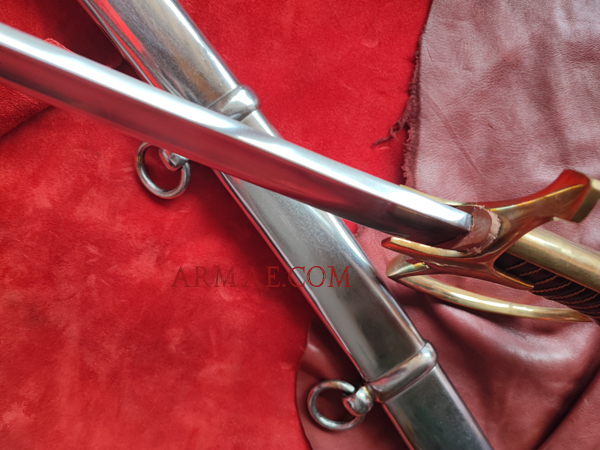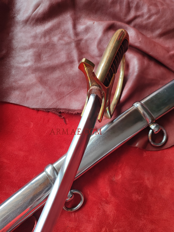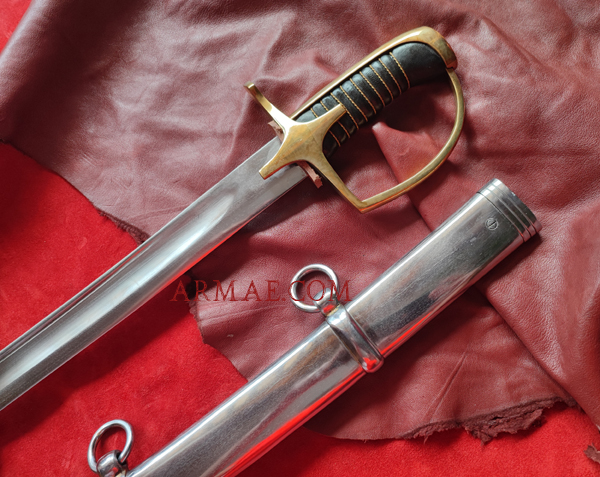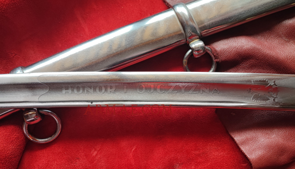 Cette pièce est une reproduction d'un sabre d’officier militaire polonais modèle 1921 / 1922. Tous les détails du modèle, y compris les marquages du fabricant et de l’armurerie, sont reproduits. La lame porte la reproduction de la signature estampillée du fabricant A. MANN, WARSZAWA, AMA. Le dos de la lame est marqué du poinçon de l’inspecteur des munitions, l’aigle national. La lame est gravée avec la devise « Honneur - Patrie » en polonais. La garde est en laiton. La poignée en bois est recouverte de cuir noir et entourée d'un filigrane en laiton torsadé. 3000 de ces sabres ont été fabriqués, notre reproduction est basée sur le numéro 1152.
