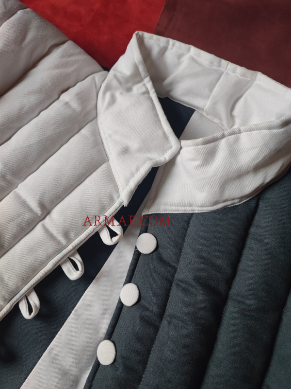 The gambeson measures 65 cm in height and 50 cm in width (100 cm chest circumference). Made of cotton fabric with a polyester lining.