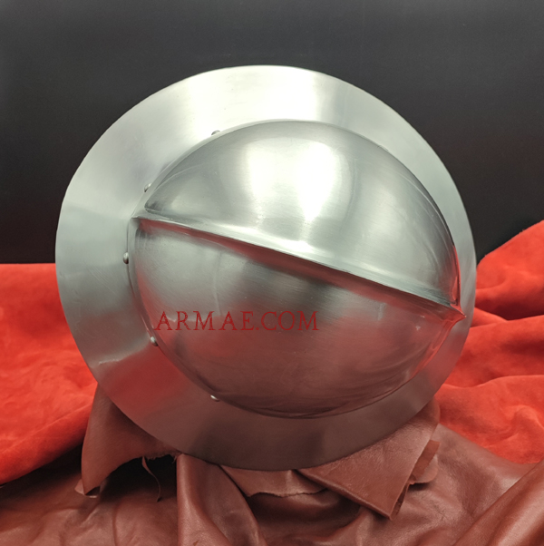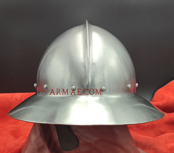 The word “chapel” comes from Old French meaning “hat.” This is clear when looking at the shape of this helmet, which was very fashionable from the 13th to the 15th century. It leaves the face, and therefore the field of vision, completely unobstructed, making it an ideal helmet for archers. However, medieval images show that its use became widespread, even among knights, who wore it over a mail coif. This type of helmet could be painted.