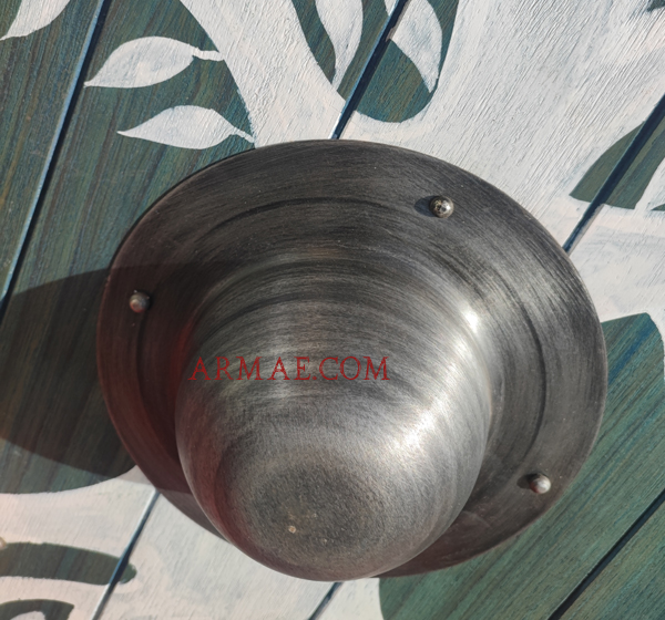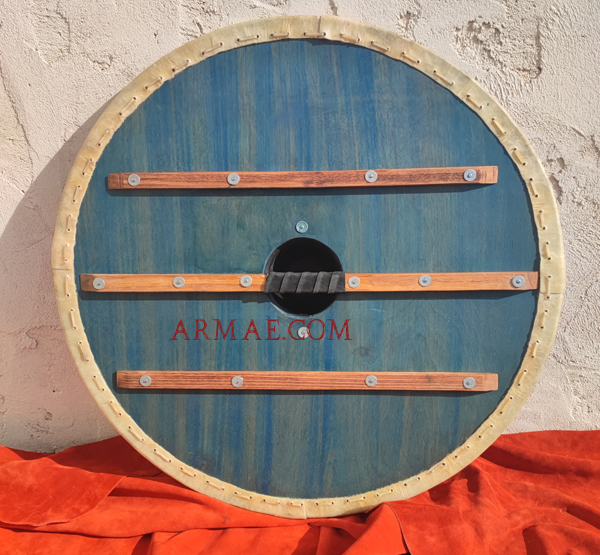 Wood and rawhide, iron boss (umbo). Iron reinforcements. 2cm thick. Diameter: 80 cm. Weight: 3–4 kg.