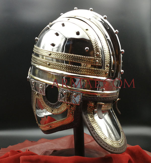 Moins connu qu'un autre casque spectaculaire retrouvé au même endroit, celui-ci n'en est pas moins intéressant. Cette reproduction reprend l'allure générale de l'artefact, mais s'en distingue par quelques variantes. L'original était en fer plaqué d'argent doré. Notre modèle est quant à lui volontairement bicolore, pour des raisons esthétiques. De plus, les éléments décoratifs sont ici rapportés et rivetés.