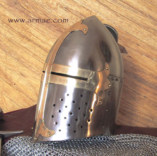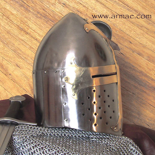 Sous le règne de St-Louis, le sommet du heaume retrouve une forme pointue, ce qui permet de dévier les coups de haches et d'épées, qui glissent dessus sans l'entamer. Cette reproduction présente une décoration laitonnée des plus esthétiques. Comme beaucoup de casques à cette époque, il peut être peint aux couleurs du chevalier.