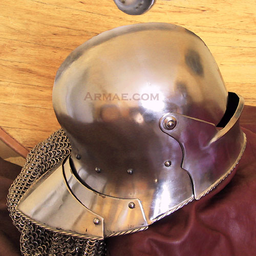 Les salades étaient des pièces d'armures très solides et bien conçues pour assurer un maximum de protection aux piétons comme aux cavaliers. Leur visière abaissée n'offrait cependant qu'un champ de vision limité. La bordure inférieure de l'ouverture est ici proéminente pour qu'une lame ou une pique ne vienne pas glisser sur le métal et blesser les yeux. Le couvre-nuque est bien prononcé, composé de tôles articulées qui assurent une plus grande souplesse au casque et un plus grand confort au combattant.