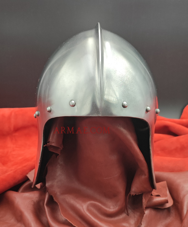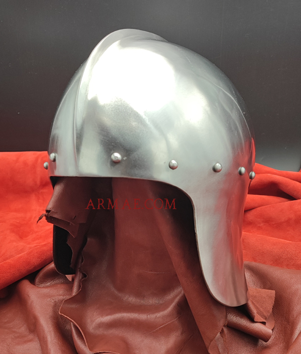 Ce modèle de bassinet est une évolution de la cervelière qui ne protégeait initialement que le sommet de la tête, mais qui va étendre progressivement ses bords pour couvrir aussi ses côtés et l’arrière. La face ouverte offre toujours un grand champ de vision, ce qui explique qu’il fut très en vogue chez les archers et arbalétriers. Dans les faits, il fut utilisé par tous les hommes de guerre du XIVe et XVe siècles. Son intérieur est garni de cuir et est doté d’une jugulaire pour le maintenir en tête.