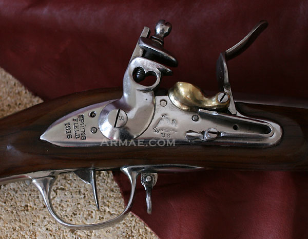 Le Springfield 1816 est une copie quasi conforme du Charleville 1777 modifié an IX français. Il en diffère par l'absence d'encoche au niveau de la joue sur la crosse, un support du pontet entièrement plat et un ergot de fixation de la baïonnette au-dessus du canon. On notera les marquages caractéristiques, avec l'aigle américain sur la platine. L'année de production, 1816, est gravée sur la queue de culasse.