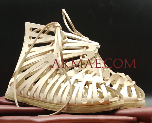 De nombreuses paires de sandales militaires romaines ont été découvertes par les archéologues. La caliga est une chaussure largement ajourée qui permet au pied d’être bien aéré, ce qui est un avantage pour un marcheur. Sa conception et sa forme diffèrent peu, sinon dans le dessin des lanières et quelques détails mineurs.