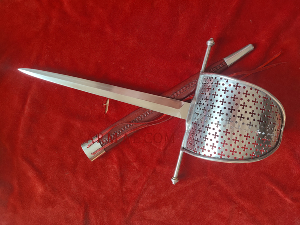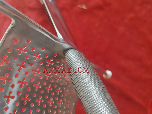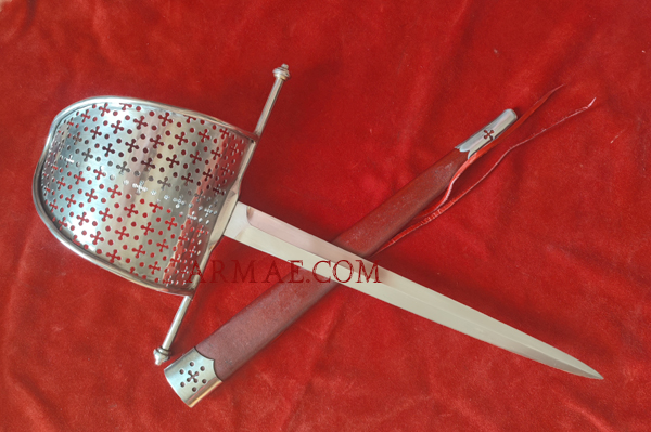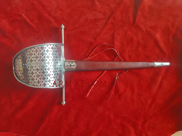 Lame en acier au carbone trempé. Garde en fer, filigrane en fer. Fourreau en bois recouvert de cuir avec appliques laiton.