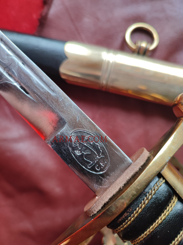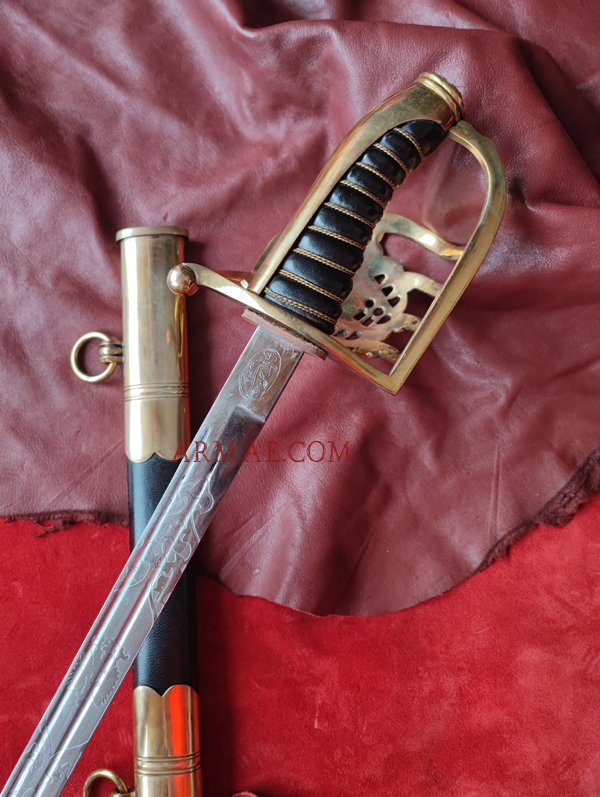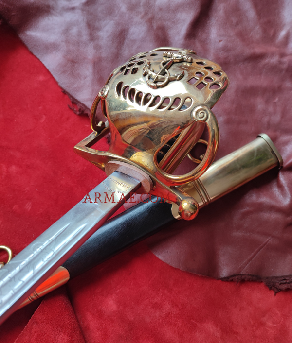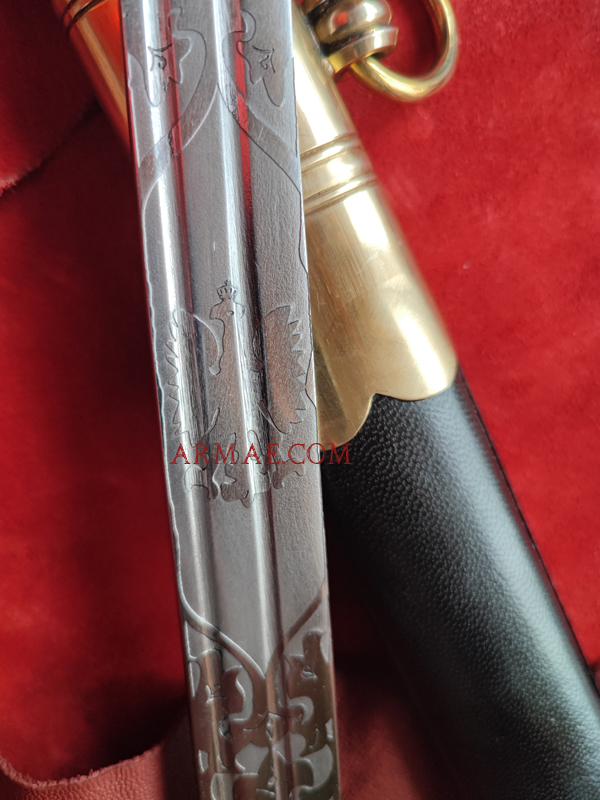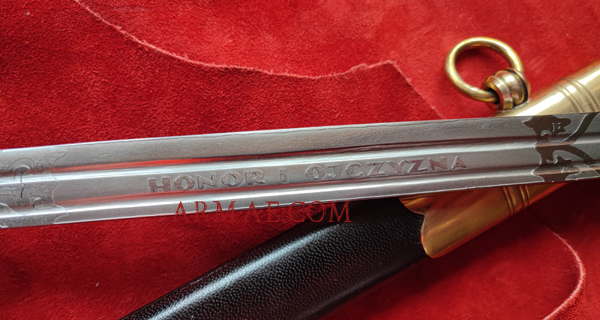 Cette magnifique réplique a été réalisée d’après un sabre original d’officier de marine polonais, modèle 1922. La lame est gravée et porte l’aigle polonais ainsi que la devise « Honneur - Patrie ». Les marquages sur la lame ont également été reproduits, indiquant que l’original provenait de Solingen, et le poinçon carctéristique en forme d'écureuil de Solingen. La garde est en laiton poli coulé. La poignée en bois est recouverte de cuir noir et entourée d'un filigrane en laiton torsadé.