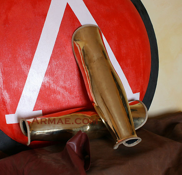 The Greek hoplite had to protect his legs which were not covered by his big round shield. He therefore equipped himself with greaves. They were usually made of bronze, thick enough to protect the warrior but thin enough to be opened to put them on.