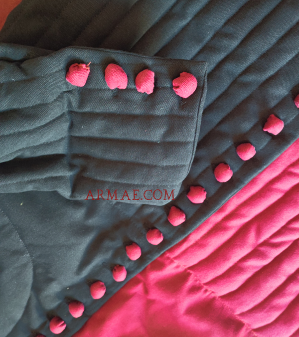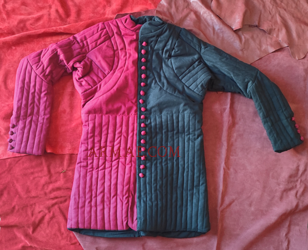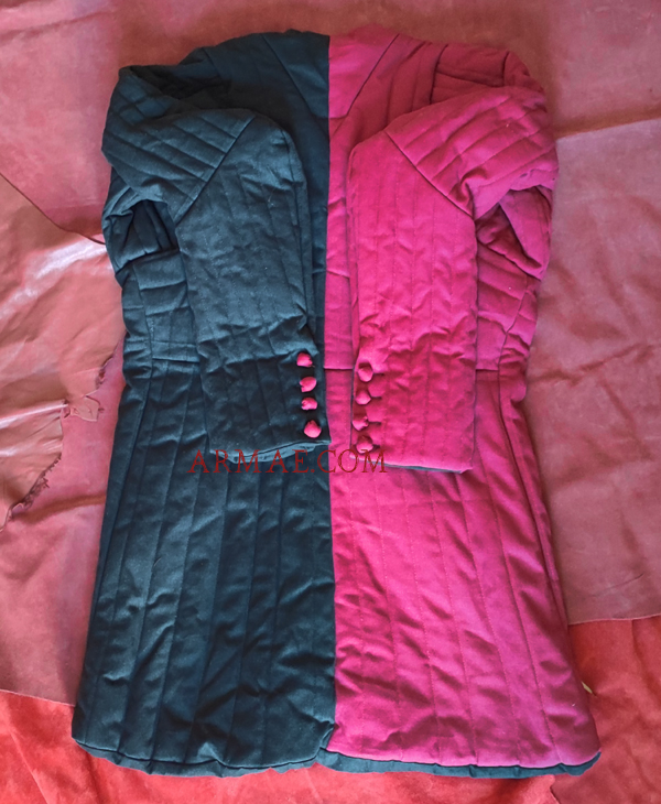 In the 13th century, the gambeson became somewhat shorter to match the shape of mail hauberks. Made of several layers of textile intended to cushion impacts and to slow any weapons that managed to penetrate the armor, it had the drawback of restricting the fighter’s mobility, especially in the shoulders and arms. The cut of this example improves the situation, with a clever construction over the upper body and sleeves made with a slight bend to facilitate movement. It is two-toned and fastens with fabric buttons, indicating a model worn by a warrior of some standing.