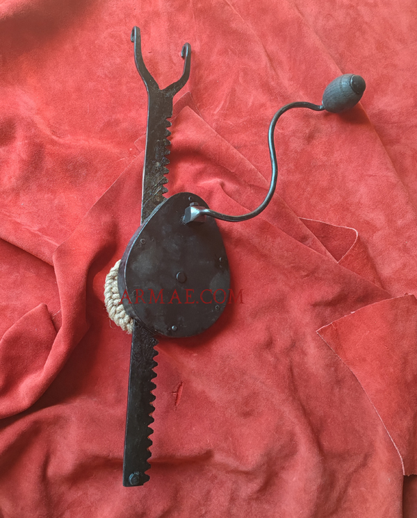 The crannequin is one of the crossbowman’s essential accessories. It allows him to re-cock the steel bow of his weapon, using a clever (but bulky) crank-and-gear mechanism. The arm is fitted with hooks to draw back the string, and the crannequin is attached to the crossbow’s stock using a cord ring.