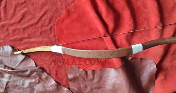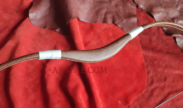 Main core of the bow is made of fiberglass covered with nubuck leather. The ends, fixed to the bow, are made of polished Ashwood. Total length 136cm, string length 123cm. Weight 790g.Made in Italy.