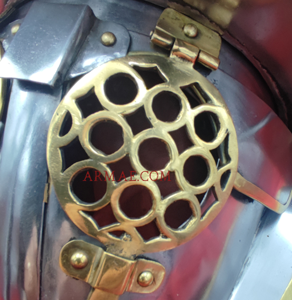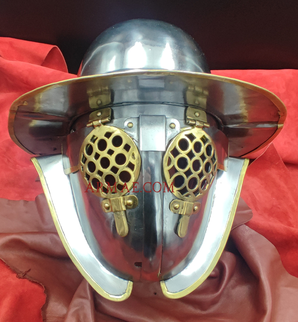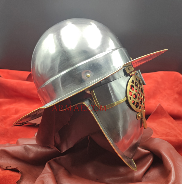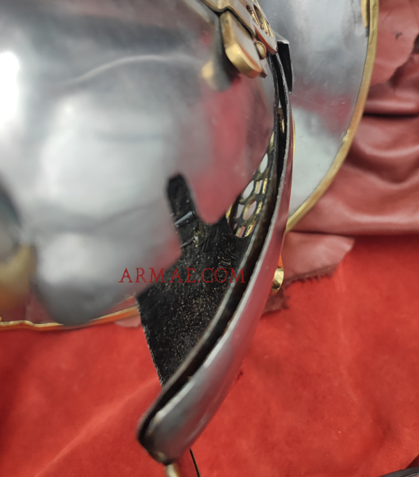 Made entirely of iron, with brass trim, this prototype is linked to the armatura of the Eques, recognisable by the absence of a crest and the full protection of the face. The cheek guards are ajar but do not open completely.