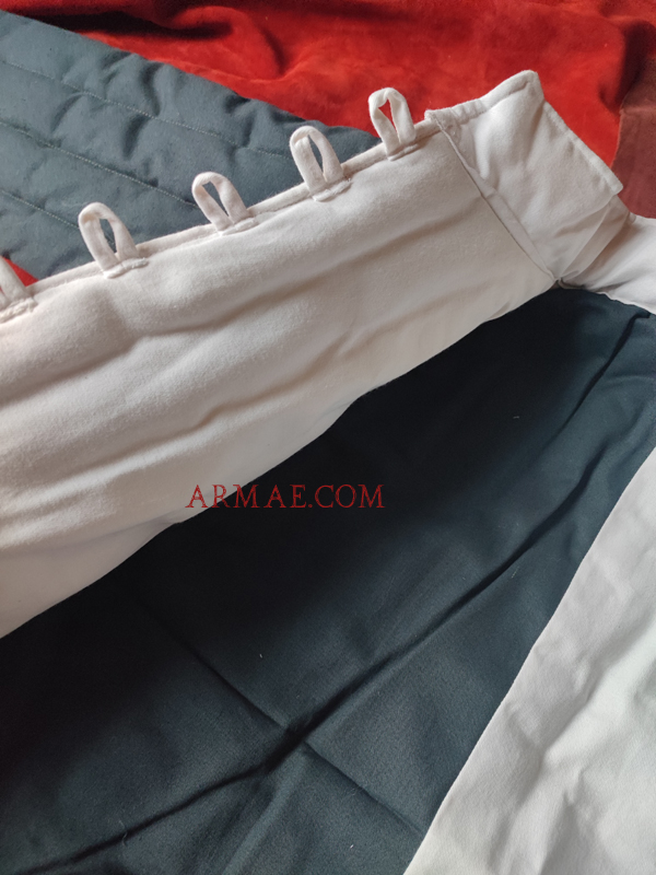 The gambeson measures 65 cm in height and 50 cm in width (100 cm chest circumference). Made of cotton fabric with a polyester lining.