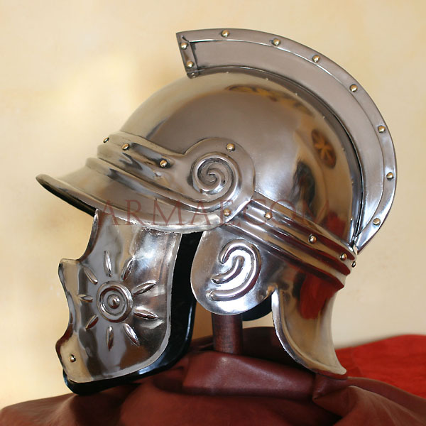This helmet is a late evolution of the classical attic helmet. This Hellenistic type was in wide use around the Mediterranean : Carthaginian, Greek and roman officers used it.