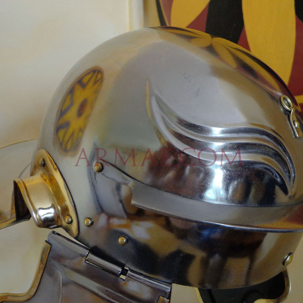 This one is another version of the imperial-Gallic F helmet type, made after an item fund on the Noviomagus roman base. It is far less decorated than the other helmets of this time period, but remains very effective for protection nevertheless.