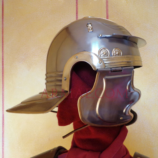This one is another version of the imperial-Gallic F helmet type, made after the Sisak original. This helmet is the only known one which was used by a centurion. It is equipped with two rings on the sides, for the transversal centurion crest.