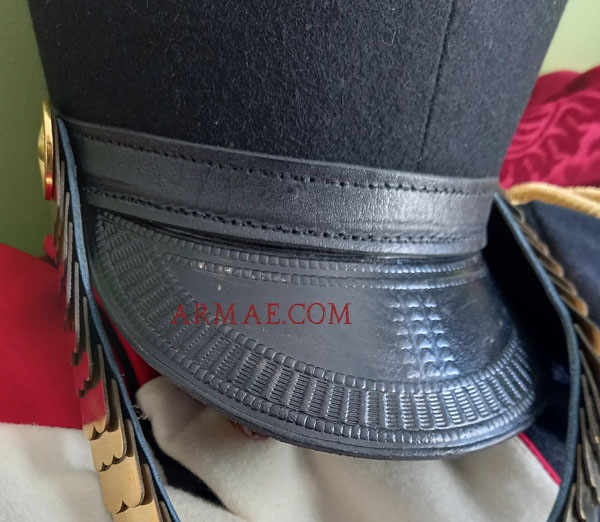 Chin straps are made of brass scale fixed on leather. The two rosettes on the sides are fusilier ones. This is a raw hat, to be completed with the regimental plate, hooks for the raquette and cordon, colored ribbons, and so on.