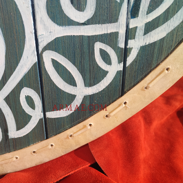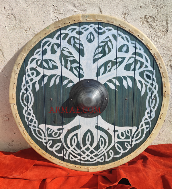 This sturdy shield, made of assembled planks fastened together with transverse reinforcements, clearly displays its Nordic origins through its decoration. It depicts the world tree Yggdrasil, which supports the nine realms of Norse mythology. With a diameter of 80 cm, it was part of the standard equipment of Viking warriors. It is held by a handgrip protected by an iron boss (umbo). Its rim of rawhide, sewn onto the wood, protects it from slashing blows.