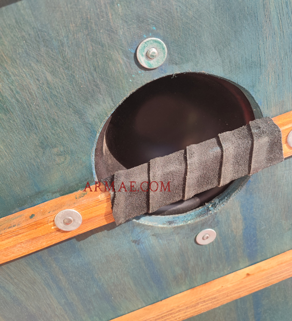 Wood and rawhide, iron boss (umbo). Iron reinforcements. 2cm thick. Diameter: 80 cm. Weight: 3–4 kg.