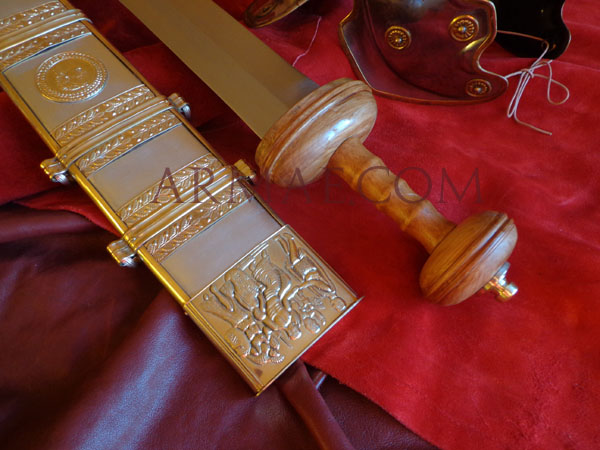 Made after the famous British museum Mainz gladius, this sword most certainly belonged to a rich officer. It shows Tiberius, as a general, offering is victory to the emperor Augustus. The middle plate of the scabbard is decorated with Tiberius' head, and the bottom shows a woman holding an axe, most probably impersonating the defeated foes.