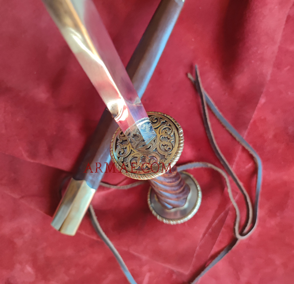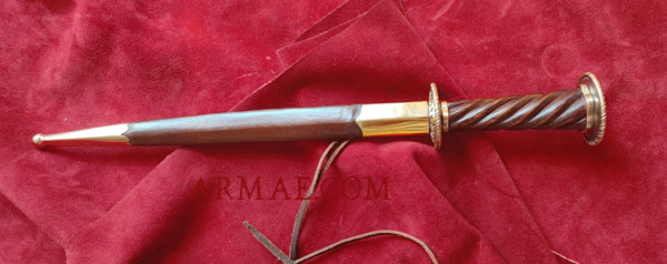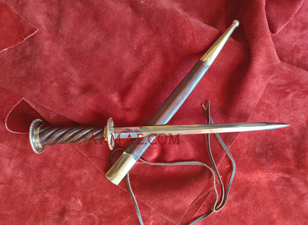 Hardened steel blade, twisted wooden grip, iron and brass rondels. Leather scabbard with brass mounts. Overall length: 37 cm, including a 25.5 cm blade. Weight: 320 g.