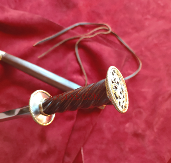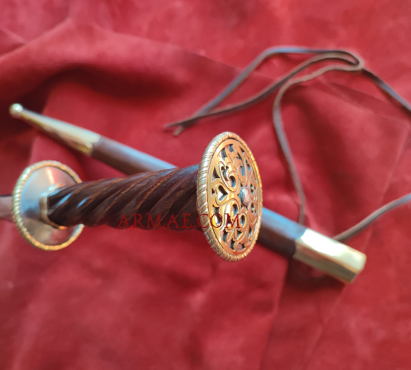 This superb reproduction of an Italian-type rondel dagger corresponds to a piece from the first quarter of the 16th century. Its long, slender, triangular-section blade is designed to slip between the plates of an opponent’s armor. While the rondel guard protects the hand, the rondel pommel allows the fighter to apply strong pressure with the other hand, in order to pierce gambesons and chain mail and reach vital organs. The richness of its decoration testifies both to the armorer’s skill and to the rank of its owner. The scabbard features two leather laces allowing the weapon to be secured to the wearer’s clothing.